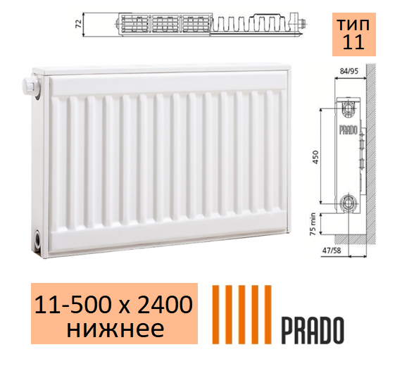 Радиаторы Prado Universal 11х500х2400 (Прадо Универсал) относятся к типу с нижним подключением. Они имеют шесть патрубков с внутренней резьбой G1/2", 4 боковых и 2 нижних. Панельные радиаторы Prado также оснащены воздуховыпускной решеткой и боковыми стенками, что придает внешнему виду изделия эстетичность и завершенность.