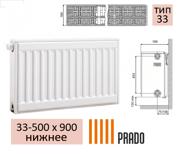 Радиаторы Prado Universal 33х500х900 (Прадо Универсал) относятся к типу с нижним подключением. Они имеют шесть патрубков с внутренней резьбой G1/2", 4 боковых и 2 нижних. Панельные радиаторы Prado также оснащены воздуховыпускной решеткой и боковыми стенками, что придает внешнему виду изделия эстетичность и завершенность.