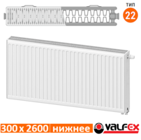 Valfex Steel VC11 300х2600 радиатор стальной, нижнее подключение, предназначен для применения в закрытых независимых однотрубных и двухтрубных системах водяного отопления жилых, административных и общественных зданий. Изготовлен из качественной холоднокатаной стали толщиной 1.2 мм. Теплоотдача радиатора 1825 Вт при ∆t - 70 ºС.