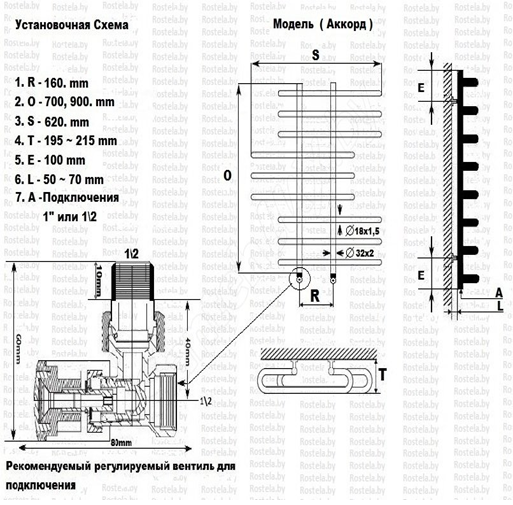 Rostela Аккорд 1/2 16х70х65, 7 перекладин, полотенцесушитель водяной, размер 160х700х650 мм, диаметр ДУ-15, выполняет сразу несколько функций - сушка мокрых полотенец и одежды, помогает избегать повышенной влажности в ванной; обеспечивает стабильную работу системы горячего водоснабжения ("компенсирующая петля"); работает как батарея отопления. В комплект входят крепления к стене.