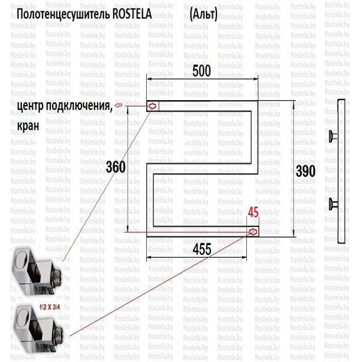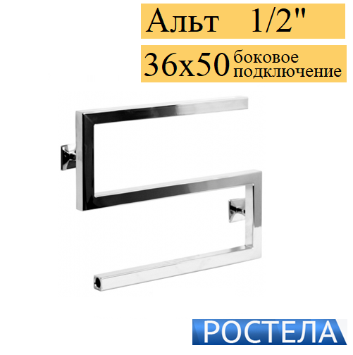 Rostela Альт 1/2 36х50, 3 перекладины, полотенцесушитель водяной, размер 360х500 мм, диаметр ДУ-15, выполняет сразу несколько функций - сушка мокрых полотенец и одежды, помогает избегать повышенной влажности в ванной; обеспечивает стабильную работу системы горячего водоснабжения ("компенсирующая петля"); работает как батарея отопления. В комплект входят крепления к стене.