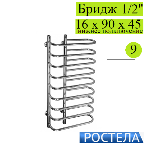 Rostela Бридж 1/2 16х90х45, 9 перекладин, полотенцесушитель водяной, размер 160х900х450 мм, диаметр ДУ-15, выполняет сразу несколько функций - сушка мокрых полотенец и одежды, помогает избегать повышенной влажности в ванной; обеспечивает стабильную работу системы горячего водоснабжения ("компенсирующая петля"); работает как батарея отопления. В комплект входят крепления к стене.