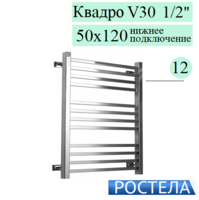 Rostela Экспи Квадро V30 1/2 50x120 белого цвета, 9 перекладин, полотенцесушитель водяной, размер 500х1200 мм, диаметр ДУ-15, выполняет сразу несколько функций - сушка мокрых полотенец и одежды, помогает избегать повышенной влажности в ванной; обеспечивает стабильную работу системы горячего водоснабжения ("компенсирующая петля"); работает как батарея отопления. Полотенцесушитель покрыт полимерной порошковой краской RAL 9016 (белый матовый). В комплект входят крепления к стене.