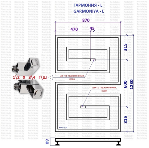 Rostela Гармония L 1/2 60х123, 9 перекладин, полотенцесушитель водяной, размер 600х1230 мм, диаметр ДУ-15, выполняет сразу несколько функций - сушка мокрых полотенец и одежды, помогает избегать повышенной влажности в ванной; обеспечивает стабильную работу системы горячего водоснабжения ("компенсирующая петля"); работает как батарея отопления. В комплект входят крепления к стене.