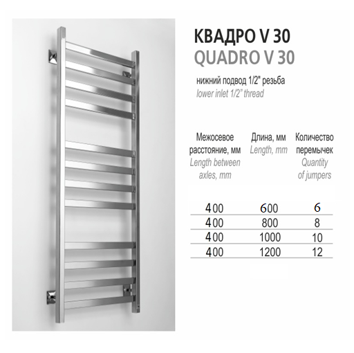 Rostela Квадро V30 1/2 50x120, 12 перекладин, полотенцесушитель водяной, размер 500х1200 мм, диаметр ДУ-15, выполняет сразу несколько функций - сушка мокрых полотенец и одежды, помогает избегать повышенной влажности в ванной; обеспечивает стабильную работу системы горячего водоснабжения ("компенсирующая петля"); работает как батарея отопления. В комплект входят крепления к стене.