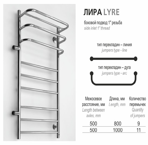 Rostela Лира 1 50x100, 10 перекладин, полотенцесушитель водяной, размер 500х1000 мм, диаметр ДУ-25, выполняет сразу несколько функций - сушка мокрых полотенец и одежды, помогает избегать повышенной влажности в ванной; обеспечивает стабильную работу системы горячего водоснабжения ("компенсирующая петля"); работает как батарея отопления. В комплект входят крепления к стене.