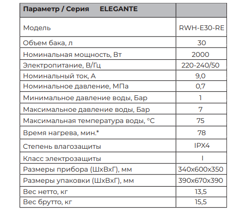 Royal Clima Elegante RWH-E30-RE водонагреватель электрический, предназначен для нагрева холодной воды, поступающей из водопровода. Применяется в бытовых целях. Благодаря тэну из меди, мощностью 2000 Вт, нагрев происходит быстрее, при этом экономя электроэнергию. Современный пенополиуретановый термоизолирующий материал равномерно «без пустот» распределен между внутренним баком и корпусом, что позволяет лучше сохранять горячую воду внутри.