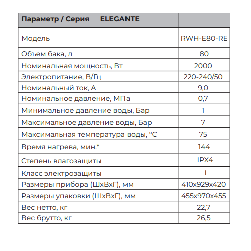 Royal Clima Elegante RWH-E80-RE водонагреватель электрический, предназначен для нагрева холодной воды, поступающей из водопровода. Применяется в бытовых целях. Благодаря тэну из меди, мощностью 2000 Вт, нагрев происходит быстрее, при этом экономя электроэнергию. Современный пенополиуретановый термоизолирующий материал равномерно «без пустот» распределен между внутренним баком и корпусом, что позволяет лучше сохранять горячую воду внутри.