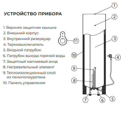 Система безопасной эксплуатации Security Project: защита от избыточного давления воды, протечек и перегрева. Современный пенополиуретановый термоизолирующий материал равномерно «без пустот» распределен между внутренним баком и корпусом.
