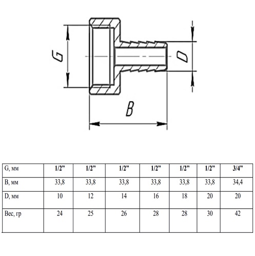 1. Диаметр 1/2", длина 14 мм, внутренняя резьба.