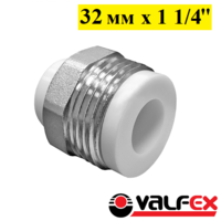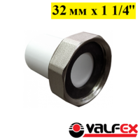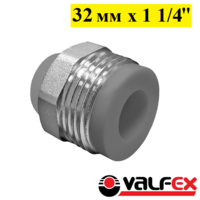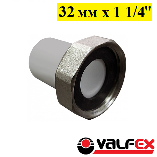 Штуцер с накидной гайкой Valfex 32 мм x 1 1/4'' серого цвета, предназначен для систем отопления и водоснабжения. Используется для подсоединения к трубопроводу из полипропилена элемента системы с резьбовым подключением. Производится методом литья под давлением, а латунные части производятся методом горячего штампования.