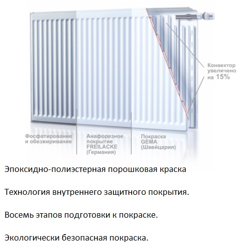 Панельные батареи отопления, которые имеют вторую покраску с помощью анафореза, который значительно продлевает срок службы внешних плоскостей отопительного радиатора по сравнению с другими производителями. Многоступенчатый процесс окраски радиатора обеспечивает эстетичный внешний вид и хорошие эксплуатационные характеристики. Поверхности имеют классическую П-образную форму для увеличения площади отдачи тепла. После покраски полиэпоксидной эмалированной краской FreiLacke (Германия) проходит высокотемпературную сушку при 180°С в покрасочной камере Gema (Швейцария).