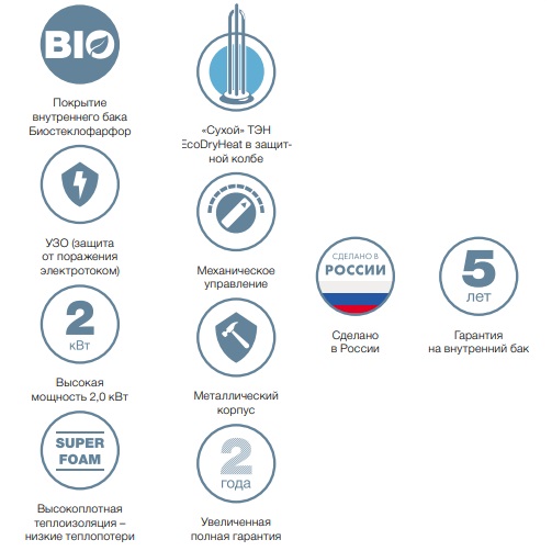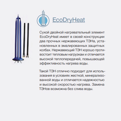Сухой двойной нагревательный элемент EcoDryHeat имеет в своей конструкции два прочных нержавеющих ТЭНа, установленных в эмалированных защитных колбах. Нержавеющий ТЭН хорошо противостоит тепловым нагрузкам и отличается высокой теплопередачей, повышающей эффективность нагрева воды. Такой ТЭН отлично подходит для использования в условиях жесткой, минерализованной воды и отличается надежностью и высокой скоростью нагрева. Замена ТЭНов возможна без слива воды.