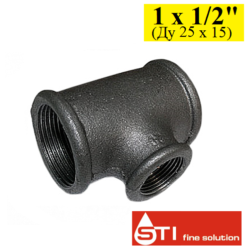 Тройник чугунный переходной Sti 25х15, трехсторонний резьбовой фитинг с переходом на диаметр другого размера, служит для соединения трех отрезков трубы, один из которых установлен перпендикулярно двум другим, диаметром 1" х 1/2" ( 25 х 15 мм).