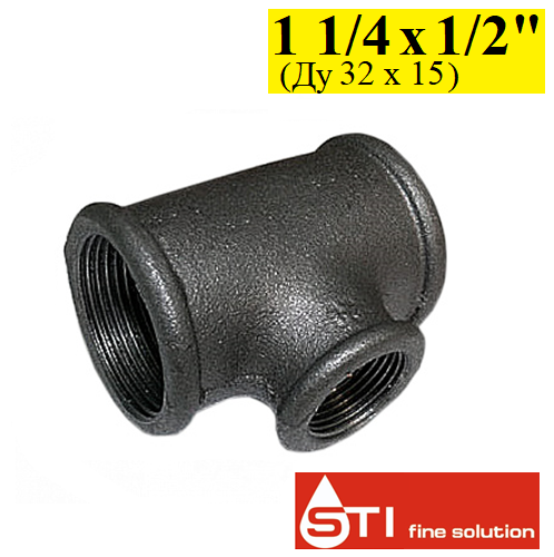 Тройник чугунный переходной Sti 32х15, трехсторонний резьбовой фитинг с переходом на диаметр другого размера, служит для соединения трех отрезков трубы, один из которых установлен перпендикулярно двум другим, диаметром 1 1/4" х 1/2" ( 32 х 15 мм).