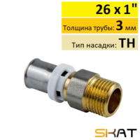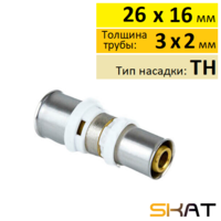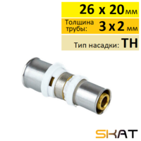 Тройник пресс Skat 26х20х20 переходной служит для разветвления металлопластиковых труб разного диаметра 26 и 20 мм. Профиль насадки инструмента TH (самый распространенный среди монтажников). Кроме соединения металлопласта этим фитингом можно соединять PEX и PE-RT трубы такого же диаметра и толщины стенки.