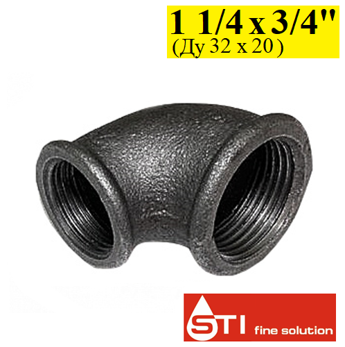 Угольник чугунный переходной Sti 32х20, фитинг служит для соединения двух труб с разным диаметром 1 1/4" и 3/4" ( 32 х 20 мм) под прямым углом.