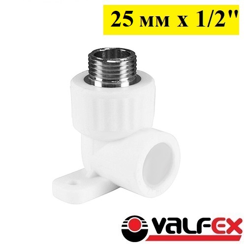 Угольник комбинированный для смесителя с наружной резьбой Valfex 25 мм х 1/2" белого цвета, предназначен для транспортировки холодной и горячей воды, системы отопления. Служит для присоединения водопроводной арматуры, смесителей и нагревателей. Производится методом литья под давлением, а латунные части производятся методом горячего штампования.