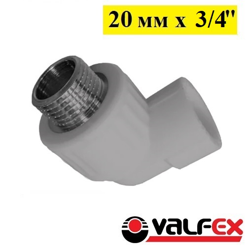 Угольник комбинированный с наружной резьбой Valfex 20 мм х 3/4" серого цвета, предназначен для транспортировки холодной и горячей воды, системы отопления. Служит для изменения направления потока и перехода на трубную резьбу. Производится методом литья под давлением, а латунные части производятся методом горячего штампования.