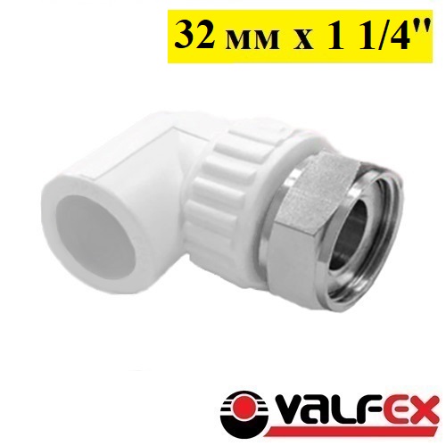 Угольник комбинированный с накидной гайкой Valfex 32 мм х 1 1/4" белого цвета, предназначен для монтажа систем водоснабжения и отопления. Представляет собой полипропиленовый фитинг для соединения под углом 90° друг к другу полипропиленового трубопровода и компонента системы с резьбовым подключением. Монтаж осуществляется с помощью накидной гайки. Производится методом литья под давлением, а латунные части производятся методом горячего штампования.