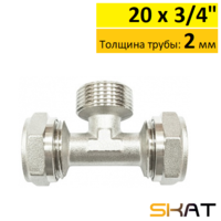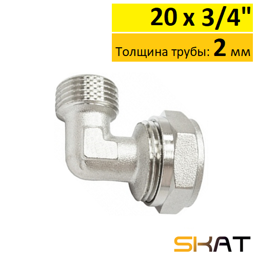Уголок обжимной 90 гр. Skat 20х3/4" с наружной резьбой, служит для соединения металлопластиковых труб диаметром 20х2 мм с запорной арматурой и другими деталями трубопроводов с внутренней резьбой под углом 90°. Используется для открытого монтажа. Кроме соединения металлопласта этим фитингом можно соединять PEX и PE-RT трубы такого же диаметра и толщины стенки.