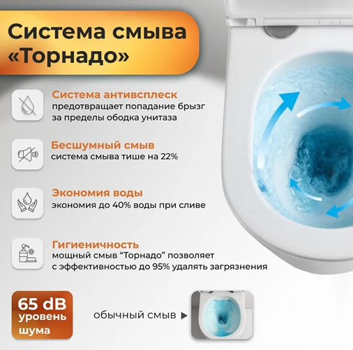 Унитаз напольный Saniteco KW-79142 безободковый с двухрежимной арматурой, тонким сиденьем с системой микролифт для плавного и тихого закрывания крышки. Имеет нижний подвод воды и потому не создает лишнего шума при наполнении бачка. Унитаз изготовлен из фаянса. Технология слива Tornado.