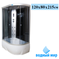 Водный мир Стандарт ВМ-886 Е L душевая кабина, размер 120x80 см. Левосторонняя ориентация кабины. Высокий поддон из акрила, армированного стекловолокном. Кабина оснащена раздвижными дверями из закаленного стекла. Используется тонированное стекло для передних стенок и чёрное стекло для задних стенок.