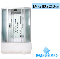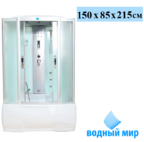 Водный мир ВМ-8207 душевая кабина, размер 150x85 см. Универсальная ориентация кабины, что подходит для любого расположения. Высокий поддон (ванна) из акрила, армированного стекловолокном. Кабина оснащена раздвижными дверями из закаленного стекла. Для передних стенок используется матовое стекло, для задних используется стекло белого цвета.