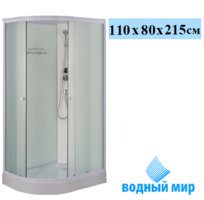 Водный мир ВМ-8801 R душевая кабина, размер 110x80 см. Правосторонняя ориентация кабины. Высокий поддон из акрила, армированного стекловолокном. Кабина оснащена раздвижными дверями из закаленного стекла. Используется тонированное стекло для передних стенок и чёрное стекло для задних стенок.