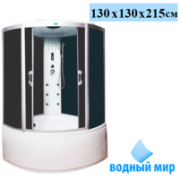 Водный мир ВМ-8817 душевая кабина, размер 120x120 см. Универсальная ориентация кабины, что подходит для любого расположения. Высокий поддон из акрила, армированного стекловолокном. Кабина оснащена раздвижными дверями из закаленного стекла. Используется тонированное стекло для передних стенок и чёрное стекло для задних стенок.