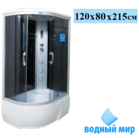 Водный мир ВМ-8824 R душевая кабина, размер 120x80 см. Правосторонняя ориентация кабины. Низкий поддон из акрила, армированного стекловолокном. Кабина оснащена раздвижными дверями из закаленного стекла. Используется тонированное стекло для передних стенок и чёрное стекло для задних стенок.