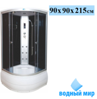 Водный мир ВМ-883 Е душевая кабина, размер 90x90 см. Универсальная ориентация кабины, что подходит для любого расположения. Низкий поддон из акрила, армированного стекловолокном. Кабина оснащена раздвижными дверями из закаленного стекла. Используется тонированное стекло для передних стенок и чёрное стекло для задних стенок.
