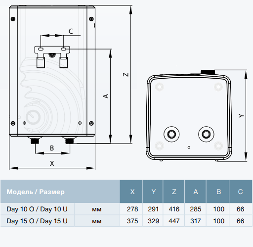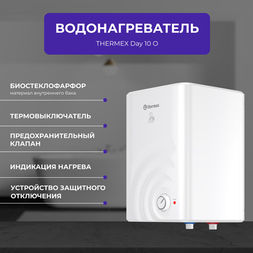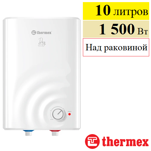 Thermex Day 10 O водонагреватель электрический объёмом 10 литров, предназначен для нагрева поступающей из водопровода холодной воды. Мощность прибора 1500 Вт позволяет нагревать воду до 45 °C за 21 минуту. ТЭН TitaniumHeat- надежный нагревательный элемент из нержавеющей стали с титаном сохраняет прочность при температурных нагрузках и отличается высокой стойкостью к коррозии. Компактный и надёжный водонагреватель с удобным управлением отлично подойдёт для установки в квартирах, частных домах и дачах.