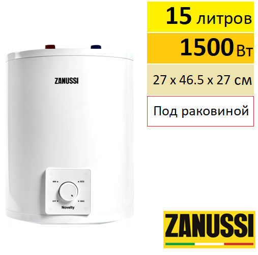 Zanussi ZWH/S 15 Novelty U водонагреватель электрический с баком из нержавеющей стали и магниевым анодом объёмом 15 литров, предназначен для нагрева поступающей из водопровода холодной воды. Мощность прибора 1500 Вт позволяет нагревать воду до 75 °C за 35 мин. Многоуровневая система безопасности и защита от коррозии. Режим ЭКО. Отлично подойдёт для малогабаритных помещений. Прост в установке, нагревает воду в минимальные сроки.